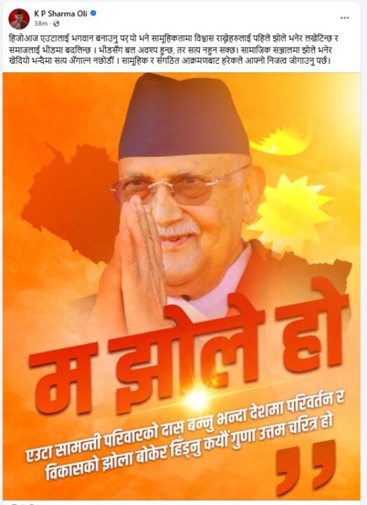 केपी ओलीको पोस्टर बाहेक पनि स्टाटस लेखिएको छ । जहाँ ओलीले झोले आरोपबाट नडराउन कार्यकर्तालाई प्रोत्साहन गरेका छन् । ‘सामाजिक सञ्जालमा झोले भनेर खेदियो भन्दैमा सत्य अँगाल्न नछोडौं । सामुहिक र संगठित आक्रमणबाट हरेकले आफ्नो निजत्व जोगाउन पर्छ’, ओलीले लेखेका छन् ।