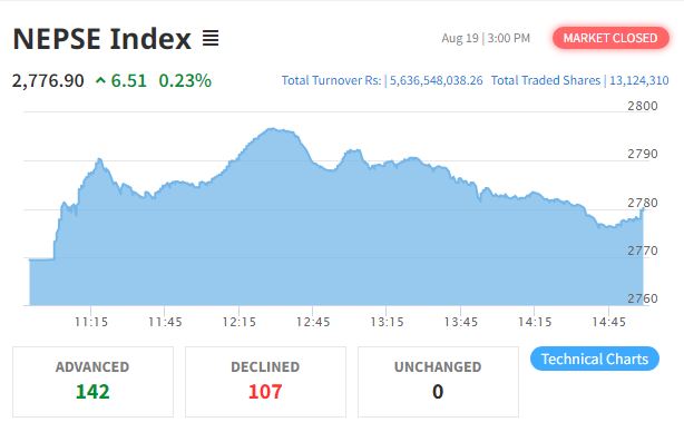 ३ भदौ- काठमाडौं, आज शेयर बजार नेप्से परिसूचक ६.५१ अङ्कले बढेर २७७६.९० को विन्दुमा रोकिएको छ ।