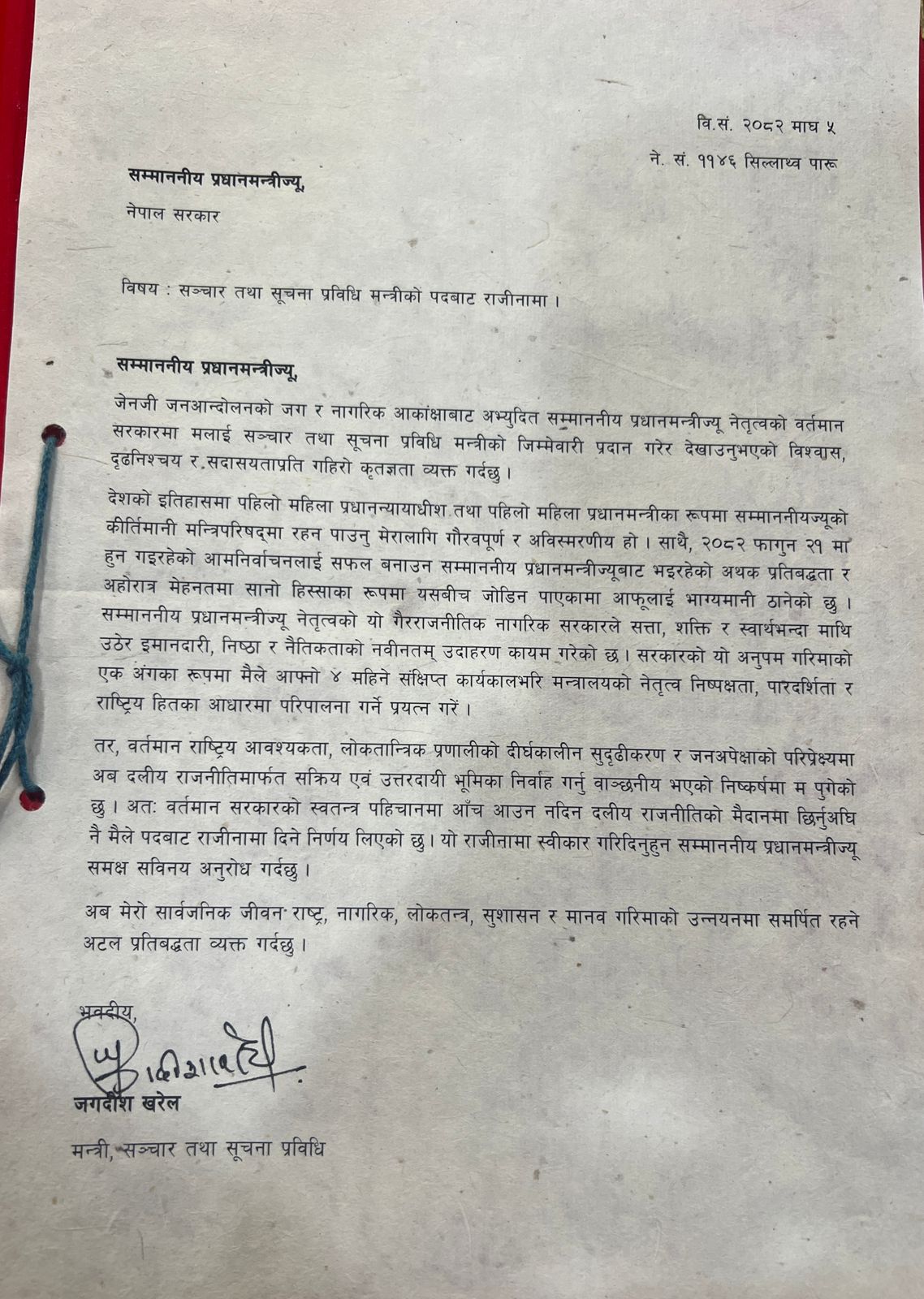 ५ माघ-काठमाडौं, सञ्चार तथा सूचना प्रविधि मन्त्री जगदीश खरेलले आफ्नो पदबाट राजीनामा दिएका छन् । उनले प्रधानमन्त्रीसमक्ष राजीनामा पेश गर्दै दलीय राजनीतिमा सक्रिय भूमिका निर्वाह गर्ने निष्कर्षमा पुगेकाले पद त्याग्ने निर्णय लिएको स्पष्ट पारेका छन् ।