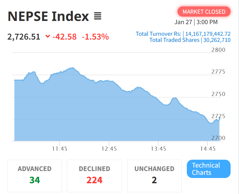 १३ माघ- काठमाडौं, आज नेपाल स्टक एक्सचेञ्ज ९नेप्से० परिसूचकमा उच्च अंकको गिरावट आएको छ । आज नेप्से परिसूचक ४२.५८ अंकले घटेर दुई हजार ७२६ दशमलव ५१ को बिन्दुमा कायम भएको हो । जुन एक दशमलव ५३ प्रतिशतको गिरावट हो ।
