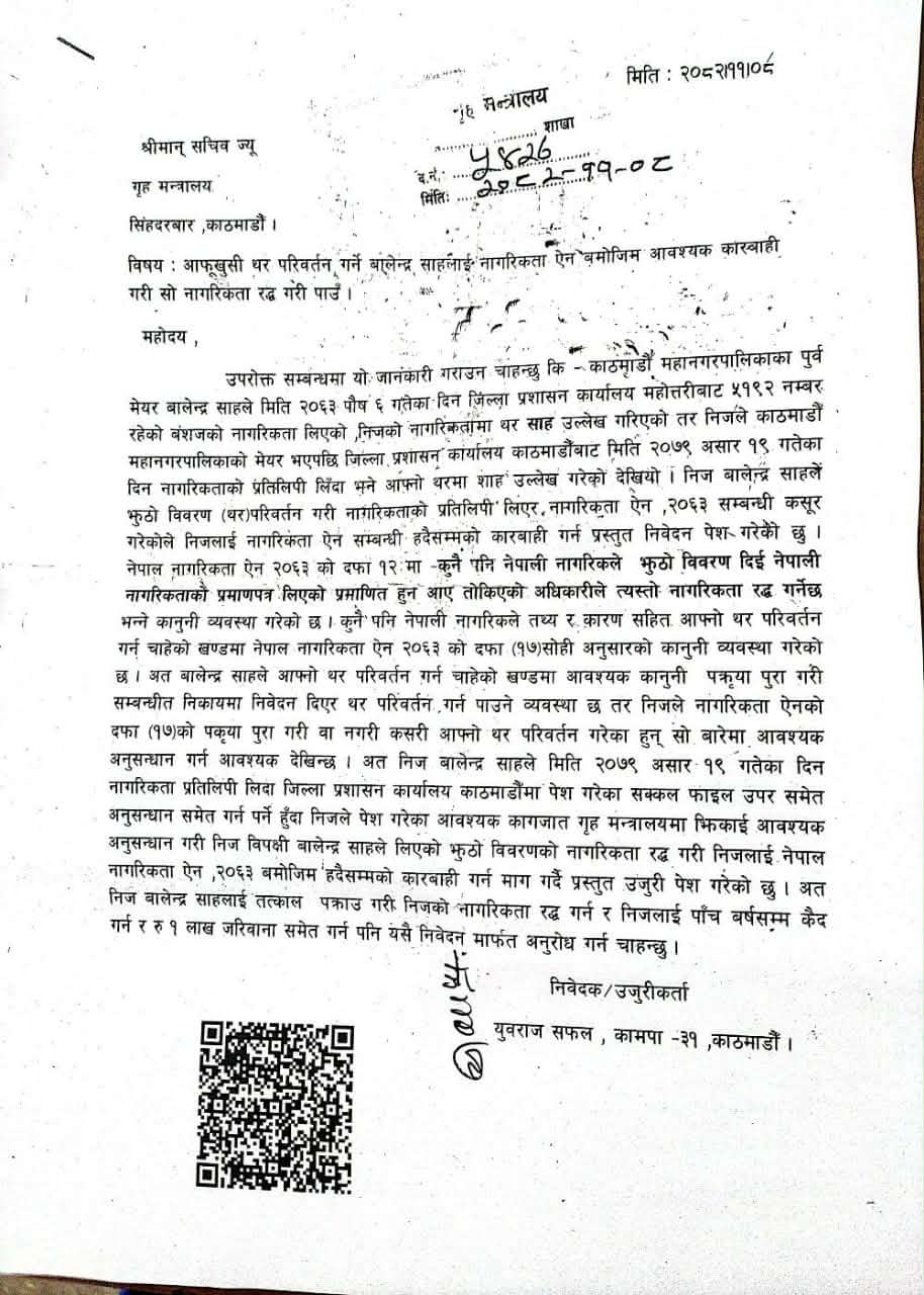 गृहमा उनको नागरिकता रद्द गरी पाँच वर्ष कैद माग गर्दै गृह उजुरी परेको हो । आज युवराज सफलले गृह मन्त्रालयमा उजुरी दिएका हुन् ।
